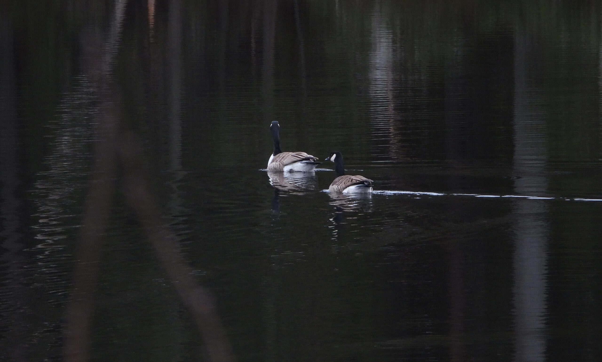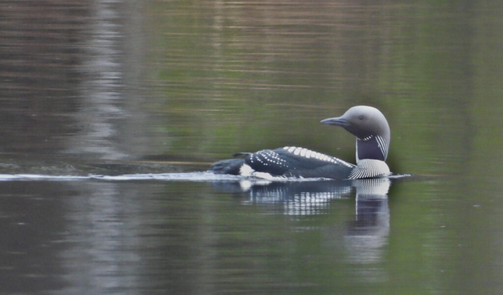 En kvällspromenad längs med sjön. Ett par kanadagäss simmar sakta ut och efter kommer ett par gräsänder. Allt går stilla och lugnt även om hunden går bredvid mig. Även han verkar vara van vid alla dessa fåglar ute på sjön. Ett bekant läte sätter igång med det vinande ljudet från kniporna som lyfter. Det finns en aning skillnad på hanens och honans vingljud som är ganska svårt att höra skillnad på om man inte hör dessa samtidigt. Plötsligt ligger de där, storlommarna. De simmar still och sakta fram och kommer riktigt nära. Denna fantastiskt grafiska fågel med en mosaik av vita och svarta fält samt grått sidenmatt huvud.