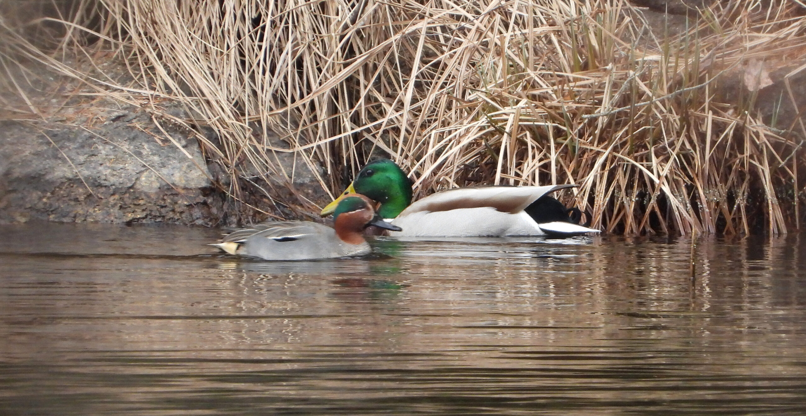 Jag blev sen sittande en stund på bänken nere vid sjön. Det är fortfarande oroligt med vågor och vinden verkar vrida runt och ska väl senare bli nordlig så det blir väl att förvänta sig lite kallare väder. En gräsand simmar längs med stranden på ön en bit ut i sjön. Där är det lä och stilla intill kanten. Men sedan ser jag något litet. Vad är det som rör sig. Jag ser ju storleksskillnaden mellan gräsanden och det som jag nu ser är ett par änder som är mycket mindre. Tanken går till någon av våra små simänder som jag dock inte känner riktigt hör hemma i denna sjö, utan kopplar mer till näringsrika och mer grunda sjöar. Det är i alla fall mer i den miljön som jag sett dessa tidigare. Innan jag hunnit hämta kameran hör jag vilka fåglar det är. Det klassiska lätet från kricka hörs tydligt. En av de fåglar som faktiskt berättar sitt namn. KRICK hörs det igen några gånger. Ett kort och ganska högt ljud från denna lilla simand. När de sedan simmar förbi gräsanden ser man hur mycket mindre de är. Färgteckningen hos krickahanen är lite speciell med det rostbruna huvudet med det gröna fältet och den nästan silvergrå ryggen och sidan.