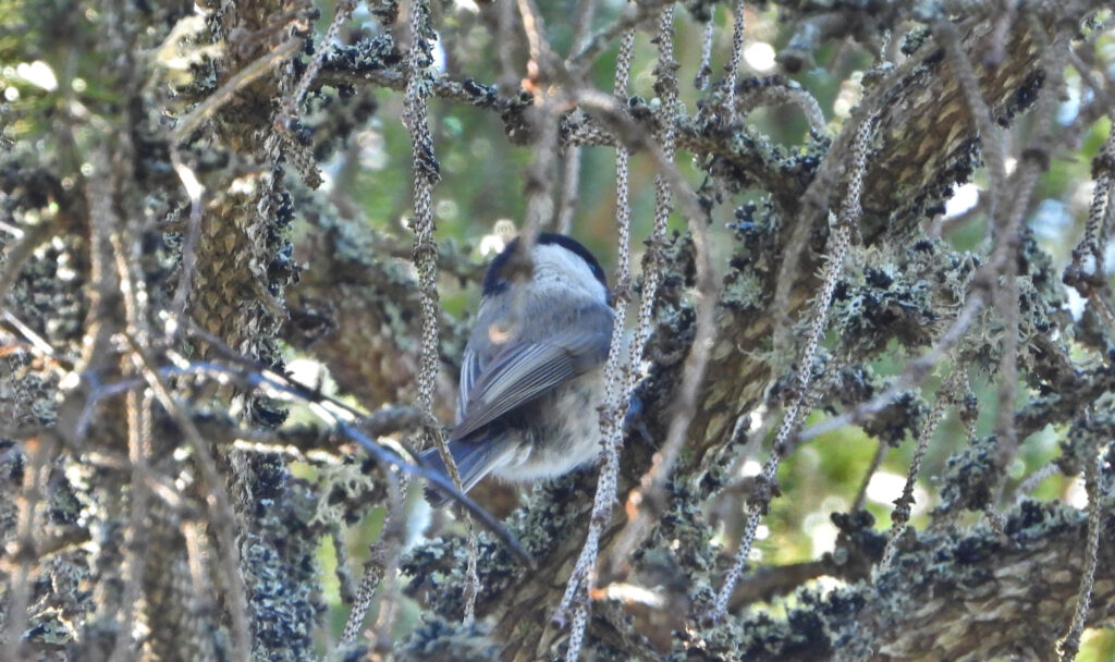 En tita som sitter i en gran bland hängande lavar och torra grenar. Att se skillnad på en- och talltita är inte alltid så lätt. Man får nästan ta det på var man ser dessa. Bor man i ett öppet landskap och ganska långt till skogen och har en tita framme vid fågelbordet så är det nog entita. Talltitan är mer skogspräglad och inte helt gärna att de flyger iväg över öppna marker. Här födosöker den för fullt efter spindeldjur och små insekter i barkspringor och bland lavar. Det är tur att de ofta meddelar vem de är med ljud. Det dröjer inte särskilt länge förrän det typiska och ganska vemodiga lätet avslöjar att det denna gång är talltita som jag har runt omkring mig. Det är några stycken i olika träd men vid närmare kontroll är det också några tofsmesar som jag dock inte fick bild på. De rör sig hela tiden så bara att få in dessa i sökare kräver tålamod.