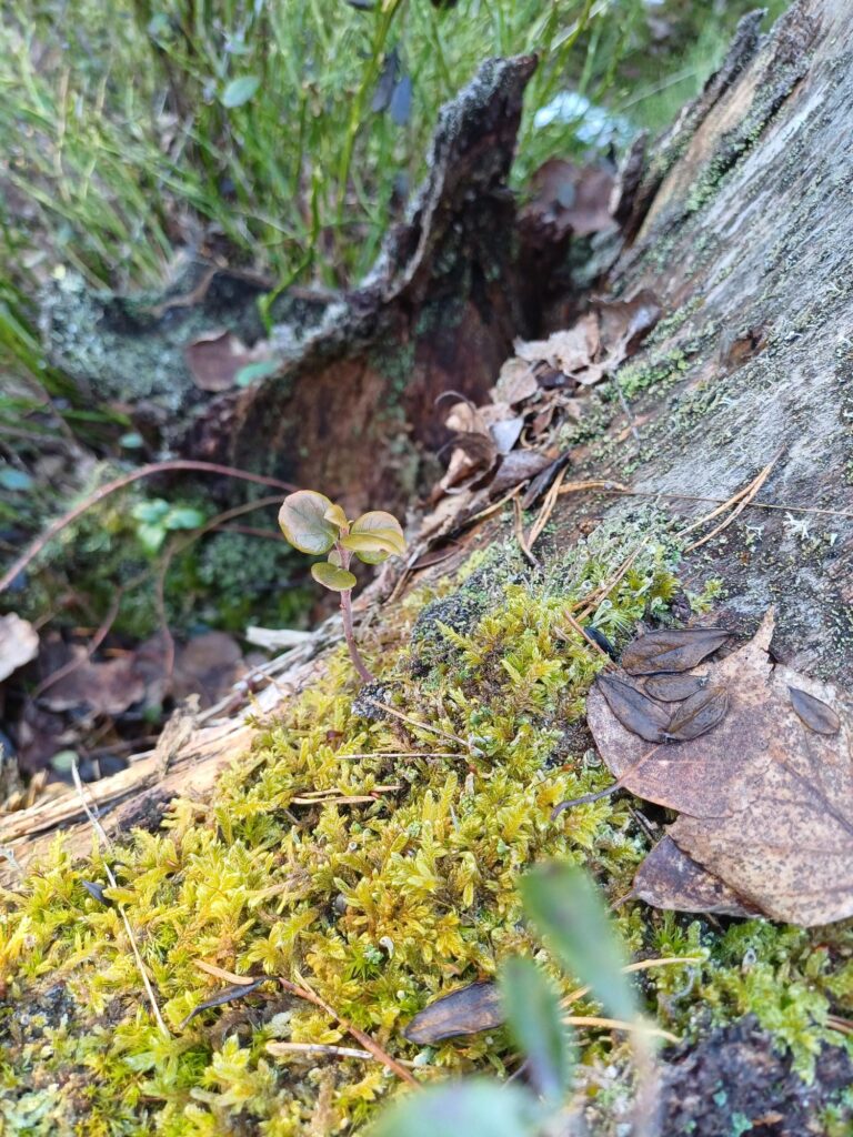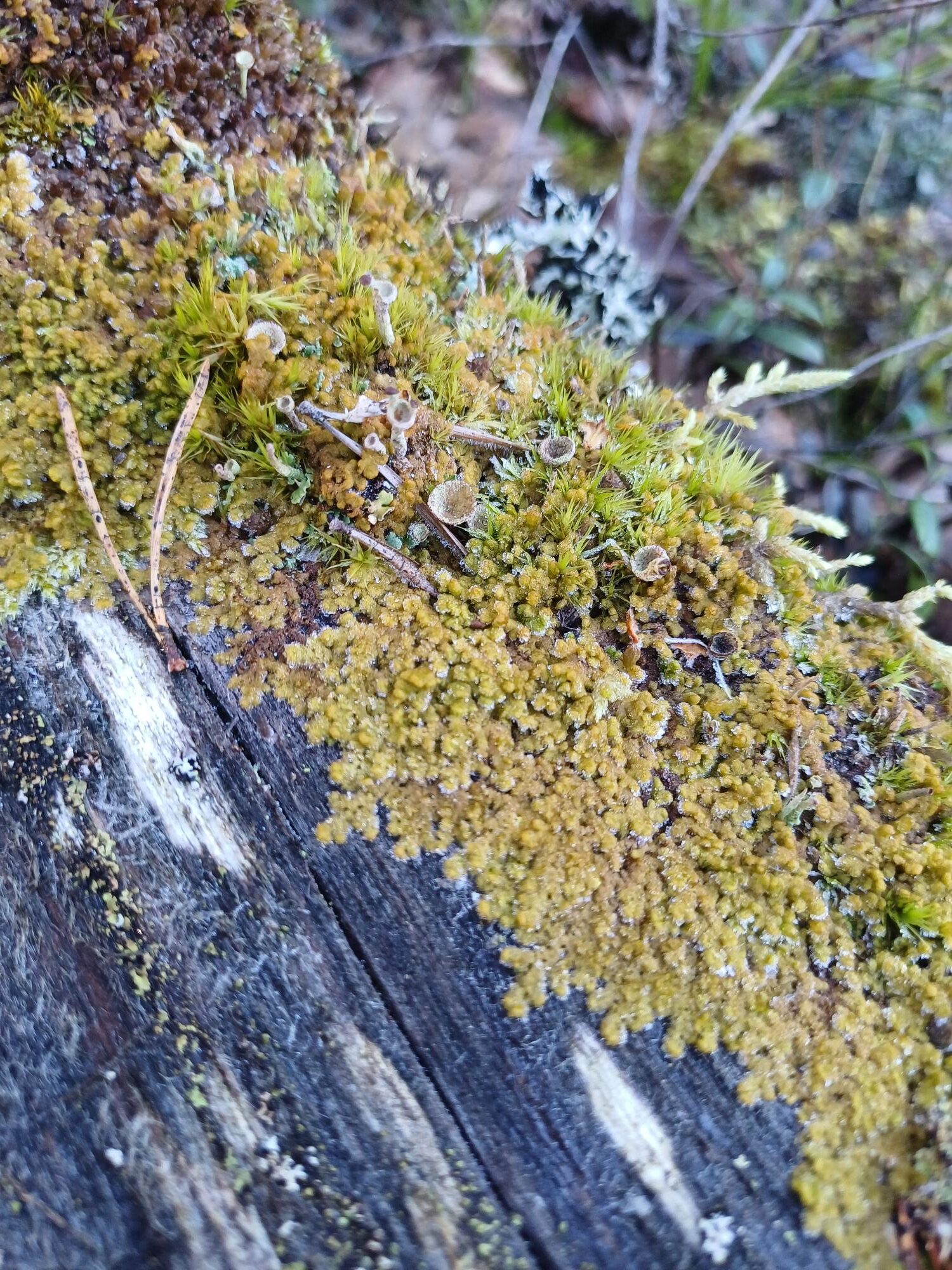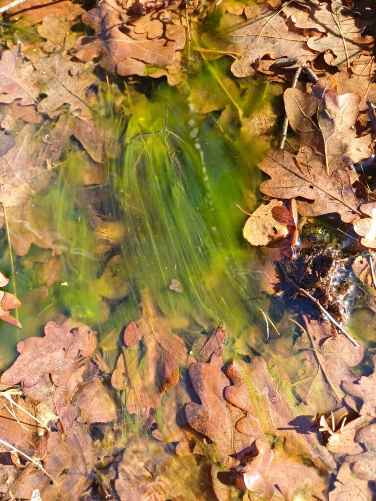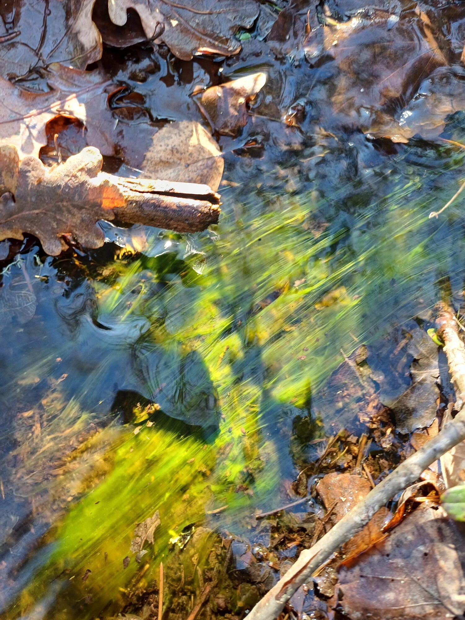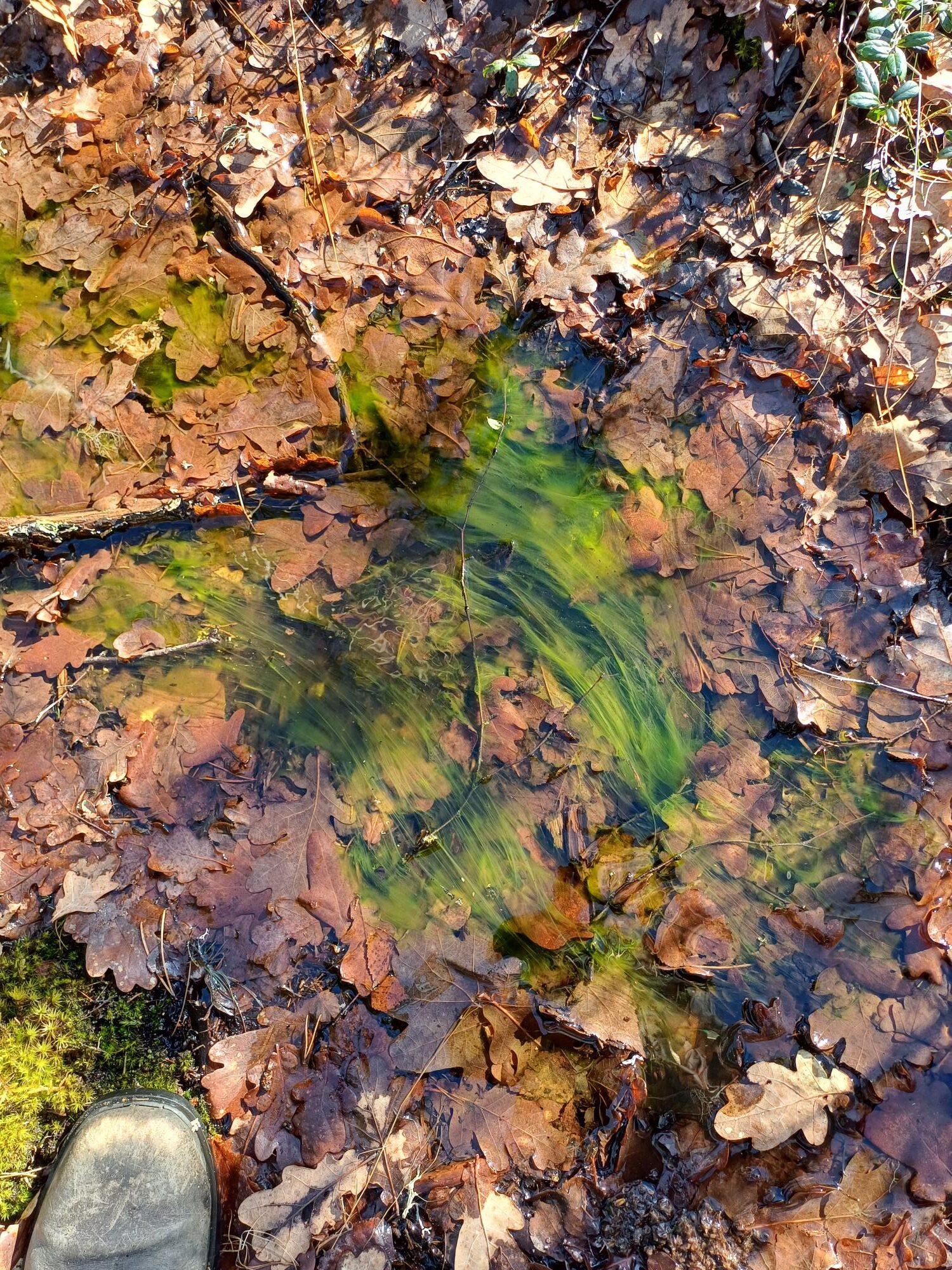 Jag står vid en bäck eller skulle nog kalla det för rännil där det är en svacka i terrängen från skogen ner mot lägre partier så ett tillfälligt stråk med smältvatten. Vattnet rinner i ett smalt flöde nerför en stenig slänt och bildar vattensamlingar. På några få platser är vattnet grönt. Ser lite ut som längs med Östersjökusten där algen grönslick är vanlig. Jag tar ner fingret i vattnet och lyfter det gröna och inser att det som jag lyfter bara är grönt slem.